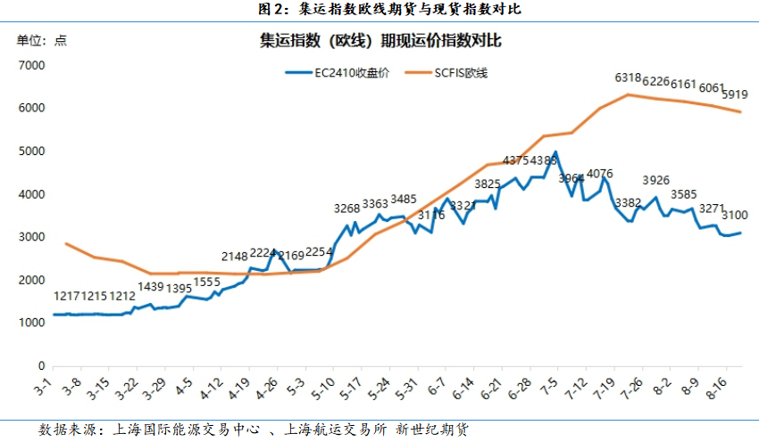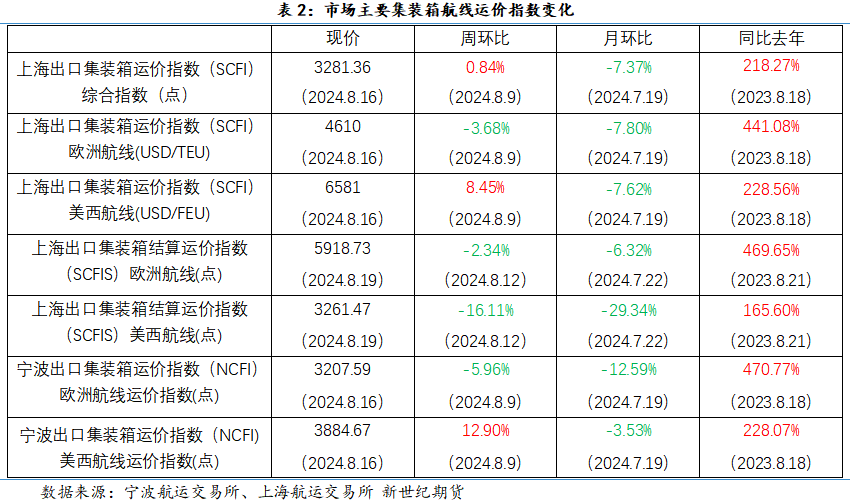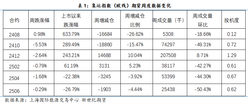 价格表现:上周(8.12-8.16),或因中东局势的不确定性,市场多空博弈激烈,上周集运欧线指数期货冲高回落。除2408合约略有上涨外,其他合约均不同程度下跌。
