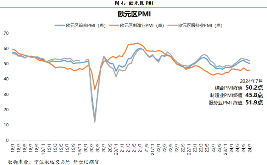 近日欧洲二季度数据新鲜出炉,欧元区(二十国)经济环比增长0.3%,好于市场预期。在欧洲经济连续五个季度处于停滞和负增长之后,今年一季度欧元区经济出现了0.3%的环比正增长,二季度也继续维持了这一同比增速。但尽管今年6、7月份欧元区综合PMI指数维持在50%荣枯线的边缘上,同一时期欧元区制造业PMI指数却仍处于45.8%的低位运行当中。整体上,欧元区二十国的经济受益于今年6月份欧央行实施的首次降息政策利好,正处于继续微弱复苏的轨道上。但若要延续复苏态势,避免步入衰退,仍需要欧央行进一步增加降息的频次和幅度。